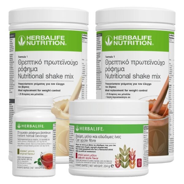 Πακέτο προϊόντων (4 τεμαχίων) για εκπληκτικά αποτελέσματα. Το πακέτο περιλαμβάνει 2 ροφήματα Formula 1, 1 ποτό μήλο – βρώμη και εδώδιμες ίνες, 1 στιγμιαίο ρόφημα βοτάνων 100g που καλύπτουν τη διατροφή, την ενυδάτωση και την τόνωση του οργανισμού.